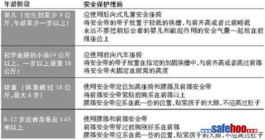 行車安全不僅關(guān)系到成人,我們還要關(guān)注兒童的乘車安全,廣大家長(zhǎng)行駛過程中一定要根據(jù)您的孩子的年齡、體重和身高恰當(dāng)?shù)貫槟暮⒆酉岛冒踩珟В?2歲以下的兒童應(yīng)嚴(yán)格按照規(guī)定坐在后排。以下是不同年齡的兒童應(yīng)該采取的安全保護(hù)措施: