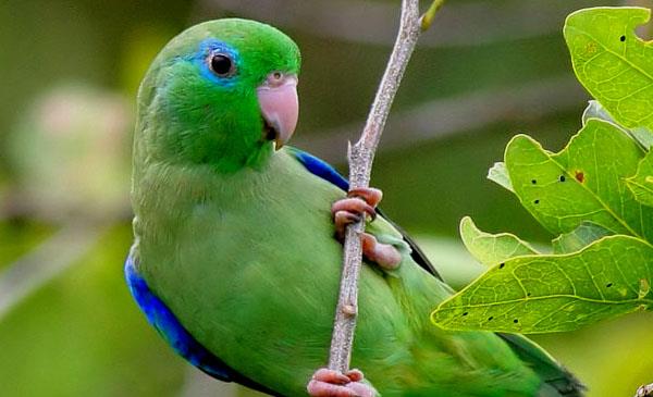 頭體長(zhǎng)10-14cm,重30-36g。鳥(niǎo)喙強(qiáng)勁有力,喙鉤曲,上頜具有可活動(dòng)關(guān)節(jié),喙基部具有臘膜。肌肉質(zhì)舌厚。腳短,強(qiáng)大,對(duì)趾型,兩趾向前兩趾向后,適合抓握和攀援生活。頂冠、額頭、臉頰和喉嚨淺黃綠色,眼睛后面有藍(lán)眼紋,枕和后頸藍(lán)灰色,翕灰綠色,上背部和小覆羽至翼肩灰褐色,下背部,臀部,小覆羽和腋羽深鈷藍(lán)色,初級(jí)和次級(jí)覆羽深藍(lán)色,次級(jí)覆羽外側(cè)的羽毛和初級(jí)飛羽內(nèi)側(cè)羽毛深藍(lán)色。鳥(niǎo)喙角質(zhì)色,眼睛褐色。