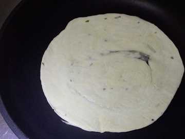 2、手抓餅胚一塊,不要解凍,直接放在無油的不粘鍋里,小火慢煎。