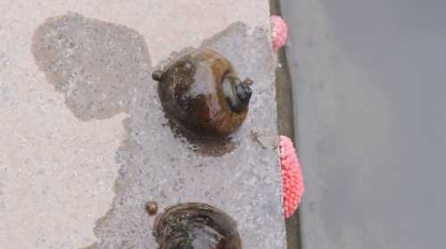 福壽螺不止可以在水中生活,它還可以在陸地上生活,在潮濕的小樹林里面,或者一些石縫里面都可以存活,并且產卵,它們的卵是紅色的,