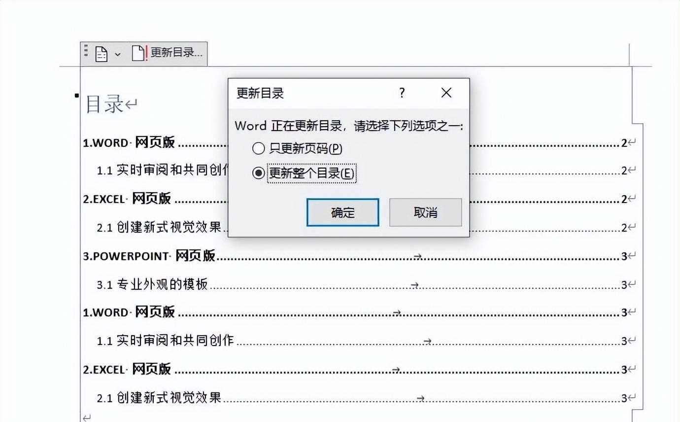 完成了標題的層級化后,就可以返回目錄,單擊“更新目錄”,選擇“更新整個目錄”,將目錄補充完整。