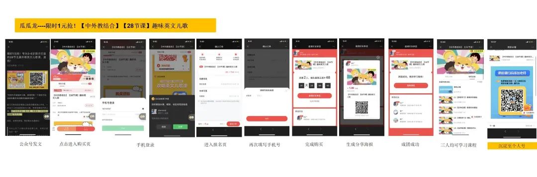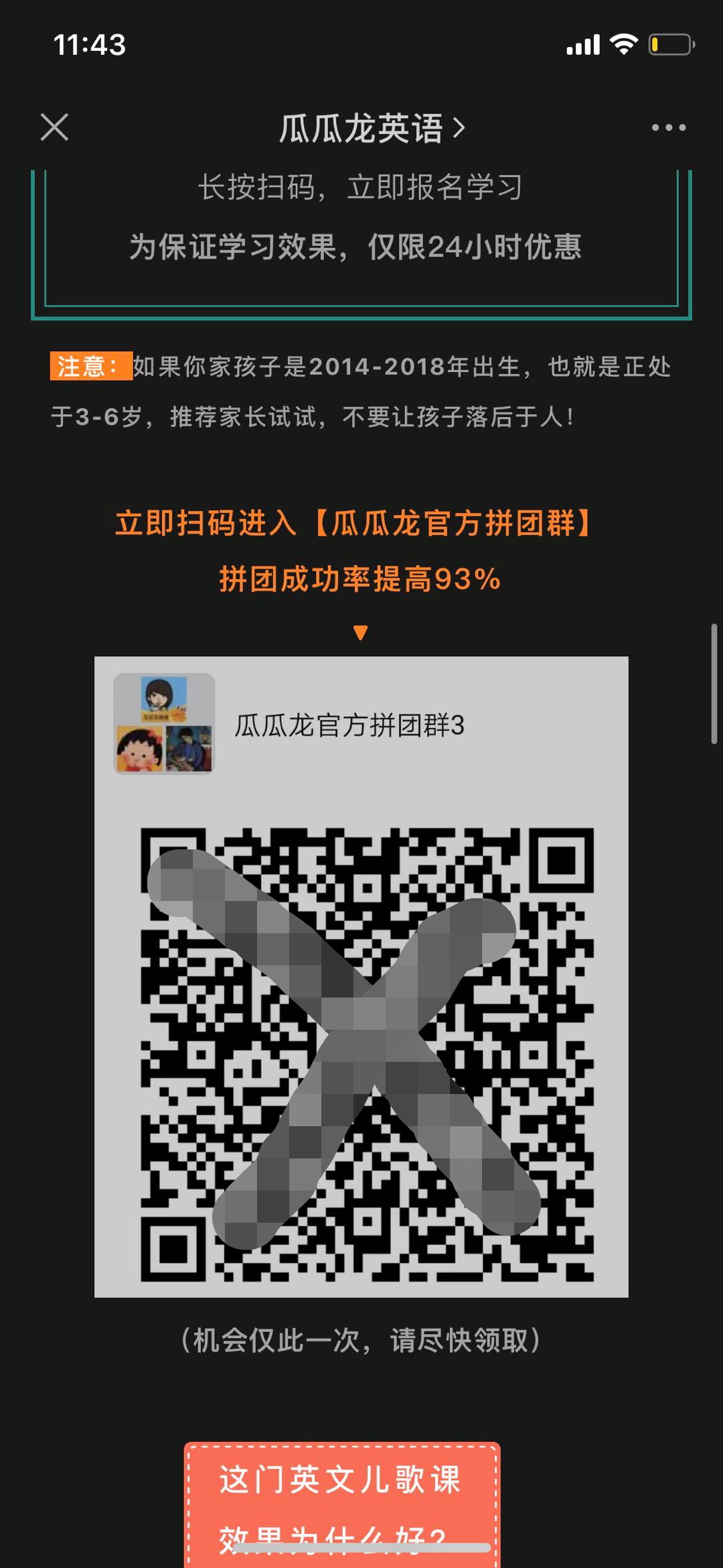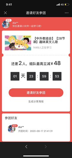 瓜瓜龍?jiān)谕莆捻撁嬗袀€(gè)地方設(shè)計(jì)的很新穎,會(huì)給家長預(yù)留一個(gè)拼團(tuán)群,并且提示拼團(tuán)成功率提高93%,這個(gè)動(dòng)作一舉兩得,既能解決家長實(shí)在找不到新用戶的問題,還能在活動(dòng)初期進(jìn)行用戶留存。幫助用戶完成轉(zhuǎn)化動(dòng)作。使用戶既定能力的提升與強(qiáng)化,通過行為設(shè)計(jì),讓用戶的操作簡(jiǎn)單而有效。
