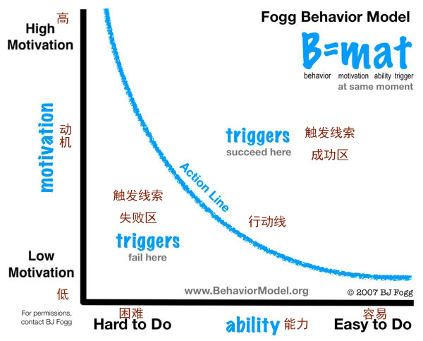 此次拆解將通過Fogg模型針對(duì)兩個(gè)活動(dòng)進(jìn)行拆解。Fogg說人的行為由動(dòng)機(jī),能力和觸發(fā)條件這三要素組成,這三個(gè)要素同時(shí)都滿足了行為才會(huì)發(fā)生,用英文字母描述就是B=MAT。