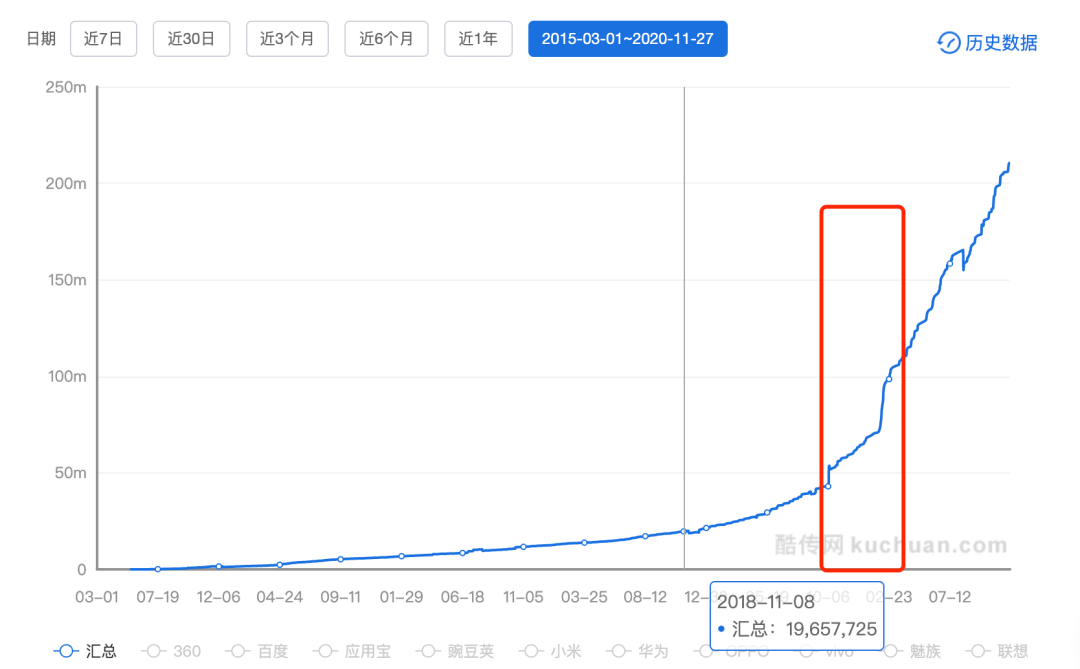上圖可以看出,2018年11月前猿輔導app的下載趨勢還是緩慢上漲,說明用戶載體量還不是很大,產(chǎn)品還處于探索階段。