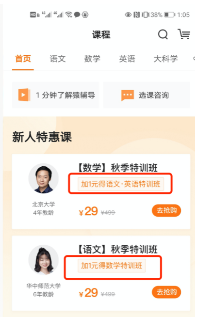 總結:低價課程轉(zhuǎn)化高價課,是猿輔導核心的玩法,但這里引用了+1元換購法(電商常見玩法),增加客單價,也算是為后續(xù)的高價課提高轉(zhuǎn)化率。