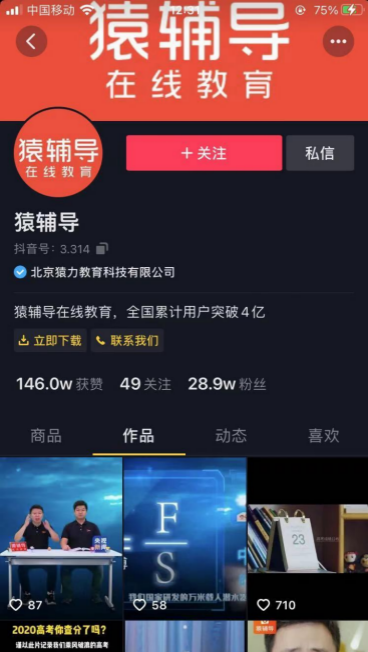 粉絲量近20萬,獲贊146萬。商品數(shù)0,說明抖音內(nèi)容與課程推廣無強關聯(lián)。抖音這塊也是發(fā)力點。