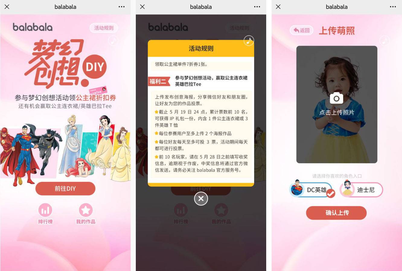 案例參考:這是由balabala出品的海報(bào)投票H5案例,用戶需要上傳圖片,并從DC英雄或迪士尼中選擇裝飾風(fēng)格,并通過背景、角色、裝飾、巴拉元素和文字裝飾等元素選擇DIY一張海報(bào)進(jìn)行參賽,然后分享給好友進(jìn)行投票,每位好友每天至多可投3票。