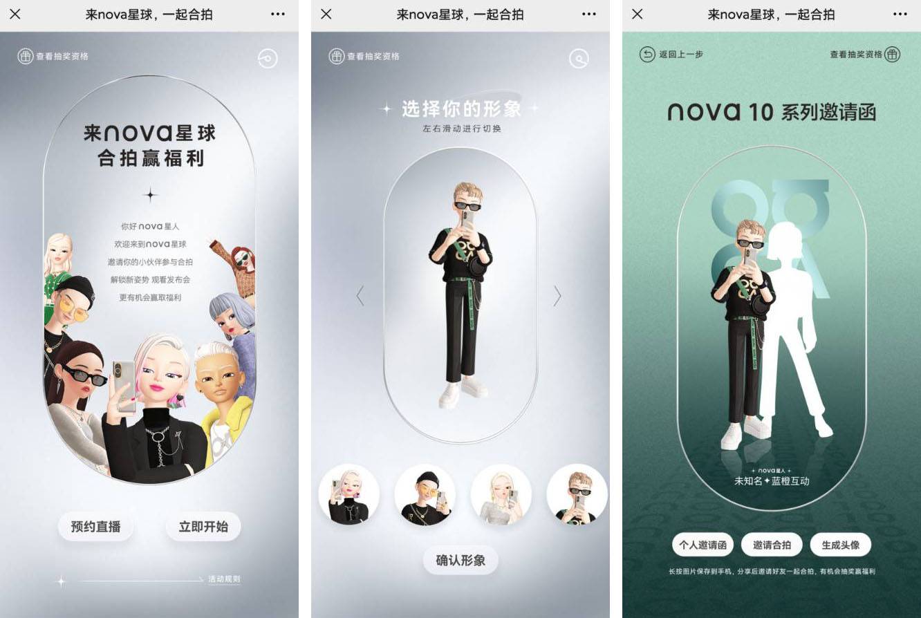 案例參考:華為NOVA10新機(jī)發(fā)布預(yù)告活動(dòng)就是采用的這種助力H5形式,用戶進(jìn)入個(gè)人形象定制頁面,在頁面中左右滑動(dòng)進(jìn)行切換,確定個(gè)人心儀的形象以及背景板,并輸入自己的昵稱,生成另一個(gè)人是空白的雙人海報(bào)。再將H5發(fā)給好友邀請合拍,好友接受邀請后打造自己的形象,生成完整的雙人海報(bào)。