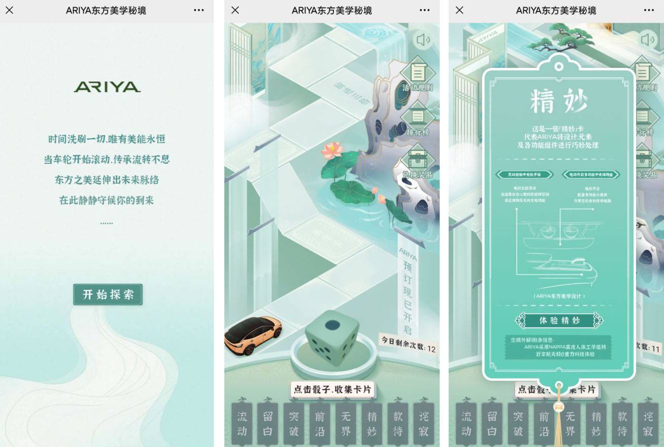 案例參考:這是由東風(fēng)日產(chǎn)ARIYA款汽車宣傳作品,在東方意境的行云流水中收獲卡片,兌換獎(jiǎng)品和沖擊排行榜,每一張卡片都有著詩詞畫意的名字,同時(shí)代表一項(xiàng)ARIYA設(shè)計(jì)優(yōu)勢,一邊了解汽車,一邊感受素雅的意境美帶來的平靜心緒。用戶可以用自己的卡片兌換獎(jiǎng)品,或與好友交換,互通有無,達(dá)到獎(jiǎng)品兌換要求。