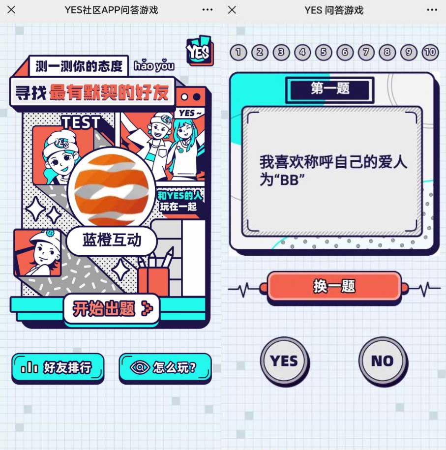 案例參考:這是由YES社區(qū)推出的好友助力答題H5游戲,H5分為兩個(gè)部分進(jìn)行,第一部分是用戶自己在H5中設(shè)置問題,讓后分享給好友;第二部分則是好友受到邀請后參與答題,然后測試出用戶與其好友的默契程度。用戶可分享給多名好友,并生成默契度排行榜,從而促進(jìn)用戶分享邀請更多好友參與活動(dòng)。