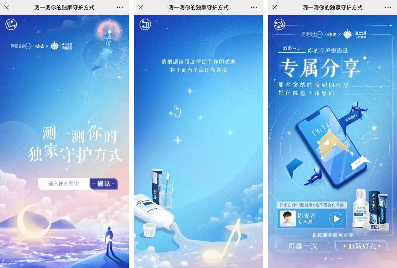 案例參考:這是由云南白藥與網(wǎng)易新聞聯(lián)合推出的畫(huà)圖測(cè)試H5,用戶可以聆聽(tīng)音樂(lè),根據(jù)內(nèi)心的感覺(jué)把給出的五顆星星按任意順序連接起來(lái),H5將進(jìn)行解析,將連接出的圖案會(huì)逐漸演化成一幅畫(huà)作,測(cè)試出用戶的獨(dú)家守護(hù)方式,借此突出云南白藥在口腔方面的“守護(hù)”主旨。