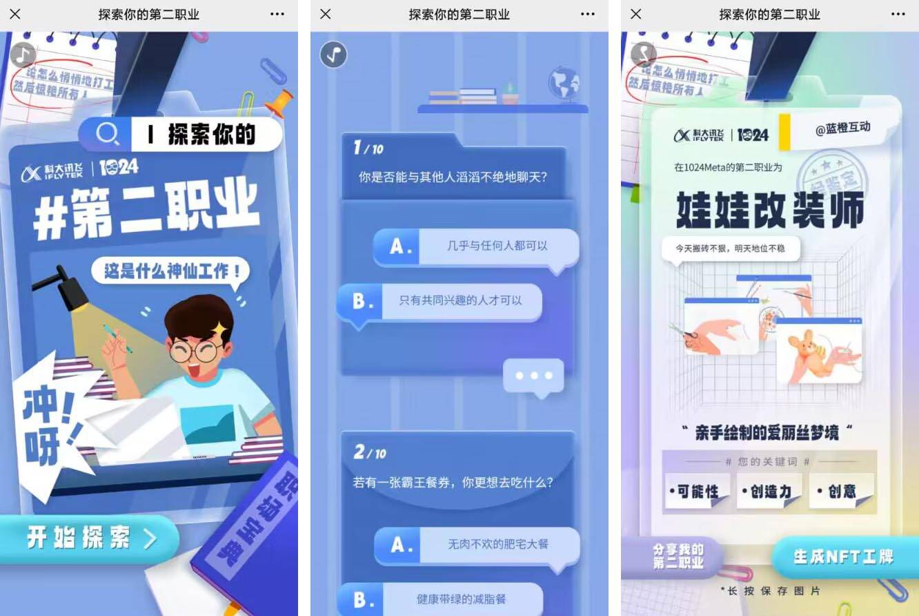 案例參考:這是科大訊飛為2022年全球 1024 開(kāi)發(fā)者節(jié)宣傳推出的測(cè)試類(lèi)H5活動(dòng)案例,邀請(qǐng)大家參與答題測(cè)試,完成答題后根據(jù)用戶選項(xiàng)生成屬于用戶的第二職業(yè)海報(bào),還可上傳一張正面照片,生成專(zhuān)屬的職業(yè)虛擬人工牌,獲取“探索你的第二職業(yè)”紀(jì)念版數(shù)字藏品。
