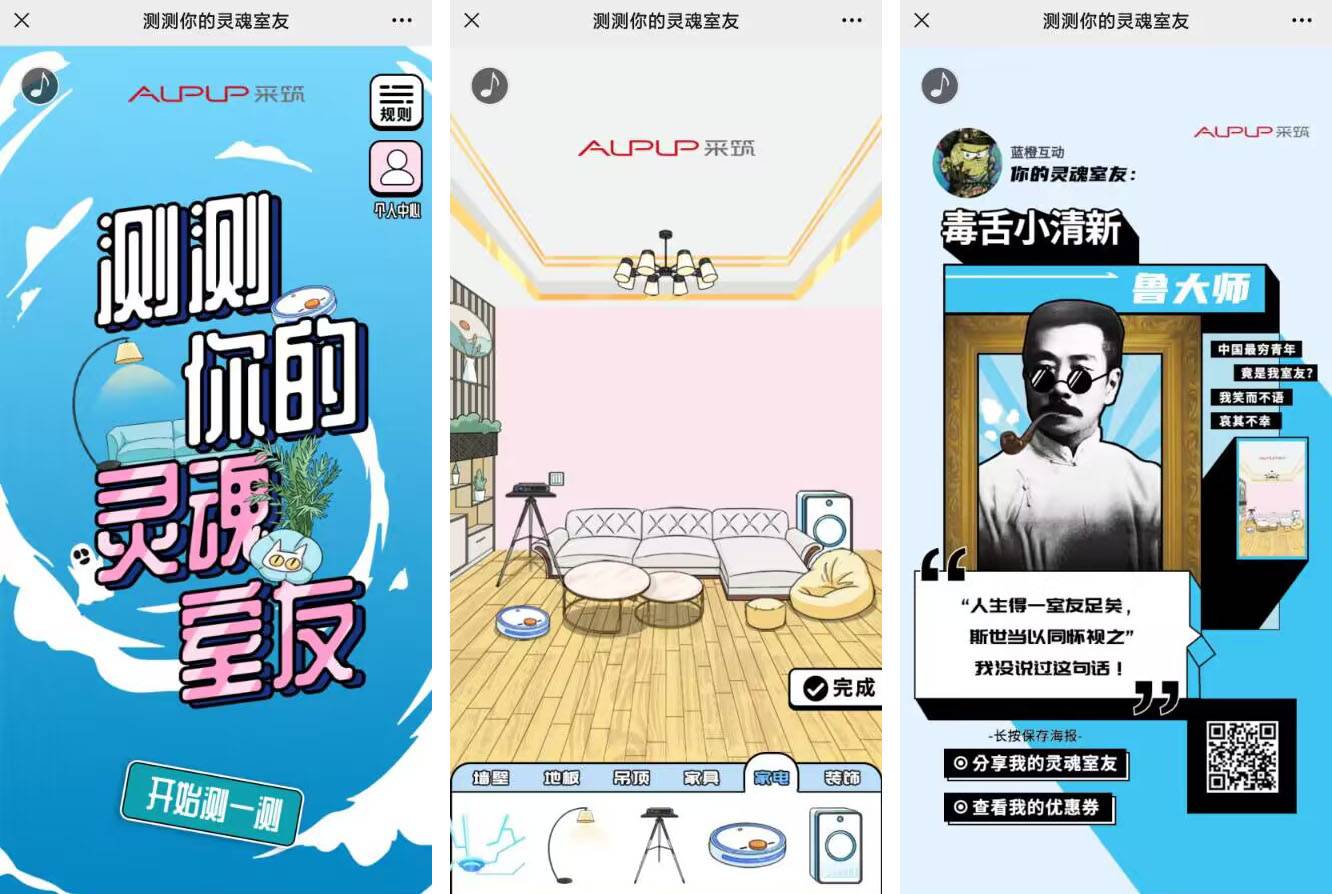 案例參考:這是由采筑電商平臺(tái)推出的DIY海報(bào)測(cè)試H5,可進(jìn)入“毛坯”客廳開(kāi)始裝修,通過(guò)選擇壁紙、地板、家具、家電、裝飾等大類(lèi)下面的不同選項(xiàng),定制化搭配出屬于自己的理想客廳,再根據(jù)客廳的裝修品味測(cè)試出與用戶匹配的“靈魂室友”,并且生成詼諧幽默的海報(bào)。