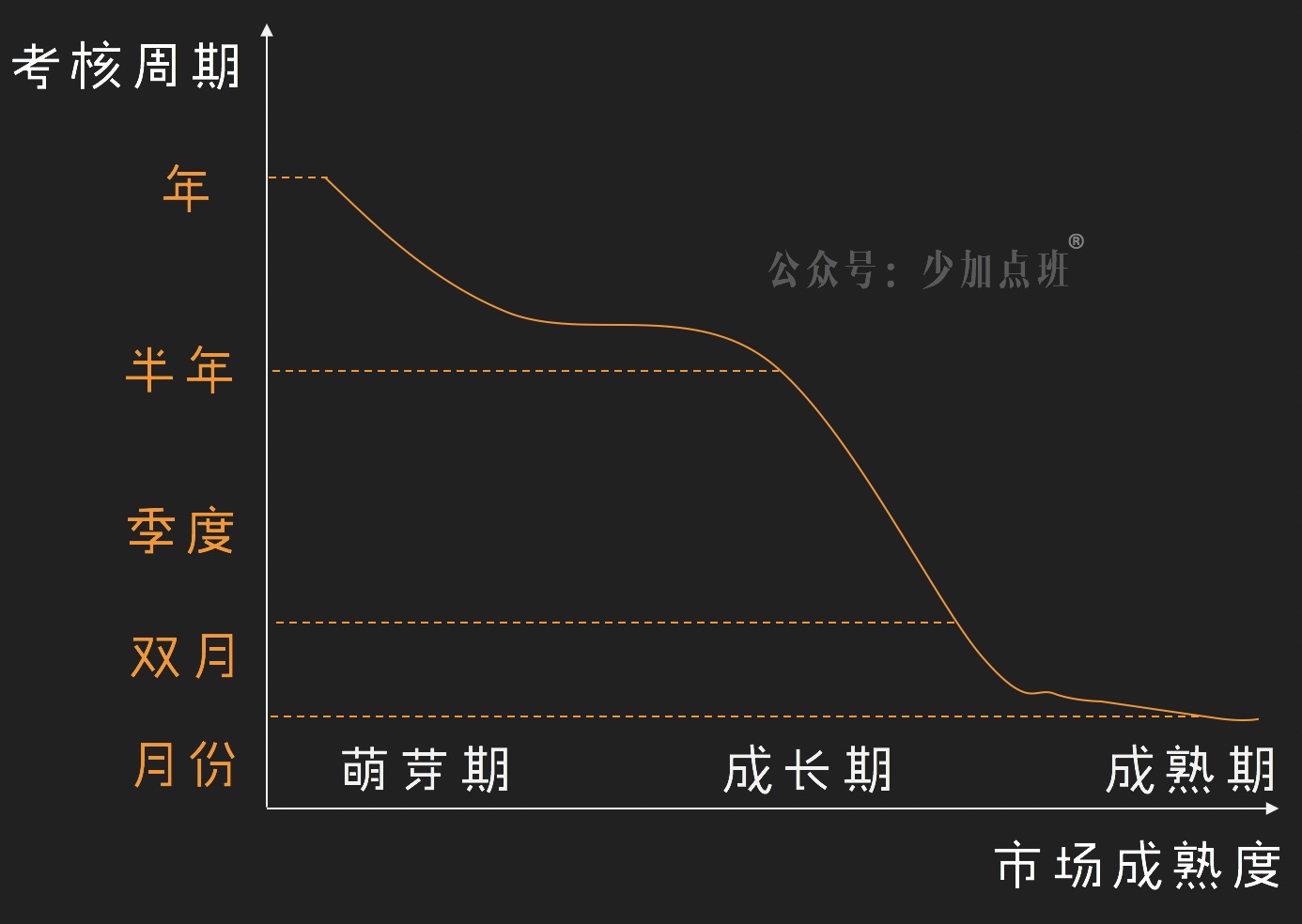 李少加推薦一個簡單的考核周期評估方式,以產(chǎn)品市場的成熟度為依據(jù),如下圖所示: