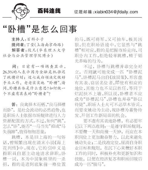 問(wèn):日前有一項(xiàng)調(diào)查顯示,26.3%的人表示因?yàn)榻鹑谖C(jī)推遲了跳槽計(jì)劃;近七成白領(lǐng)決定做好手頭工作,老老實(shí)實(shí)地“臥槽”。請(qǐng)問(wèn),臥槽具體是什么意思?如何做一個(gè)不虛有其表的“臥槽者”?