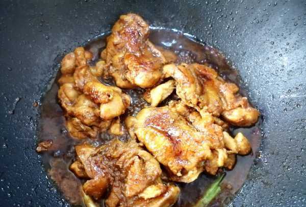 5、倒入腌料汁,燜煮至雞上色,再翻面燜煮至湯汁濃稠。