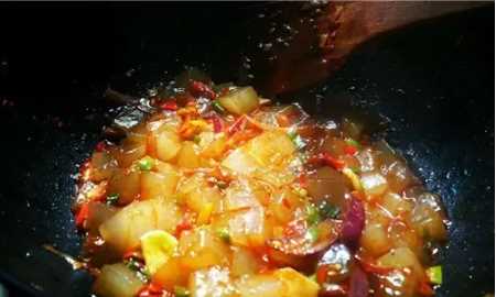 10、然后倒入剩下的1/2料汁,翻炒兩下,轉(zhuǎn)小火燉煮一兩分鐘左右即可。怕粘鍋可以用鍋鏟斜著捅一下,需要保持塊狀的話出鍋前切勿翻動(dòng)。