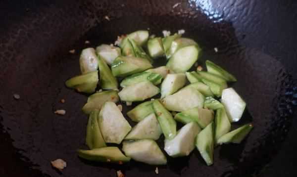 3、倒入絲瓜翻炒至絲瓜顏色有些變深,微微發(fā)軟。