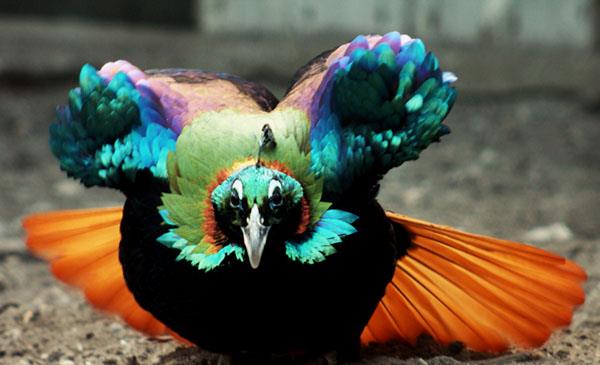 尼泊爾國鳥,又名九色鳥,非常美麗,尤其是雄鳥色彩極為絢麗,頭頂有一簇特別延長的藍綠色羽冠,其羽干細而裸出,羽端呈匙狀,向前卷曲,如同絲絨一般,甚為奇特,是虹雉中羽冠最漂亮的。