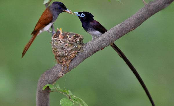 繁殖期間領(lǐng)域性甚強(qiáng),一旦有別的鳥侵入,立刻驅(qū)趕,直到趕走為止。繁殖期5-7月,營巢由雌雄鳥共同承擔(dān),每個巢5-6天即可完成,巢呈倒圓錐形,結(jié)構(gòu)相當(dāng)精致,距地高1-3m。每窩產(chǎn)卵2-5枚,多為3-4枚。卵為橢圓形或梨形,卵的顏色變化較大,有的為乳白色或白色、被有細(xì)小的紅褐色、赤白色或青灰色斑點(diǎn)。孵卵主要由雌鳥承擔(dān),雄鳥在雌鳥離巢期向亦參與孵卵活動,孵化期15±1天。雛鳥晚成性,雌雄親鳥共同育雛,經(jīng)過11-12天的喂養(yǎng),幼鳥即可離巢。