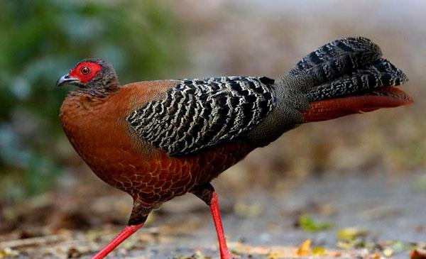 泰國國鳥,雄雞面部裸露鮮紅明艷,體色不如環(huán)頸雉靚麗,但羽冠非常有特點,黑色羽冠一簇一簇似孔雀翎,前段細小,末端則變大,但如絲線般柔軟,與其他雉雞羽冠大不相同。