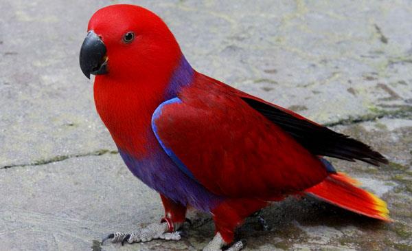 雌雄顏色反差極大,是兩性差異最明顯的鳥類之一。雌鳥鮮紅色的羽色與雄鳥亮眼的綠色形成強烈對比,非常美麗吸引人,是比較常見的中大型籠養(yǎng)鸚鵡,且比其他鸚鵡種類安靜一些,但有時仍會嘶叫吵雜,尤其在傍晚。