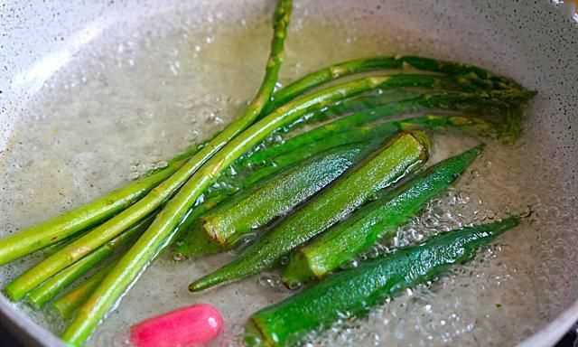 2、鍋中水煮沸后,將秋葵下鍋焯燙,焯燙時(shí)候可以加點(diǎn)鹽和食用油,使秋葵保持翠綠色澤,同時(shí)營(yíng)養(yǎng)不流失。