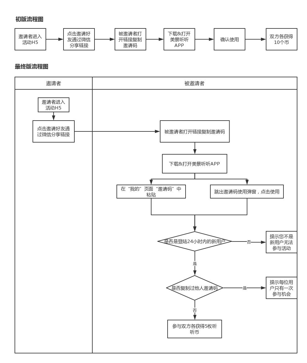 初版流程圖漏掉了兩個(gè)判斷環(huán)節(jié),和一個(gè)使用渠道,漏掉的這三部分對(duì)整個(gè)活動(dòng)有重要的影響。所以我們?cè)谠O(shè)計(jì)活動(dòng)環(huán)節(jié)上,要盡量擴(kuò)展自己的邏輯思維,把能想到的盡量補(bǔ)充在流程圖中。