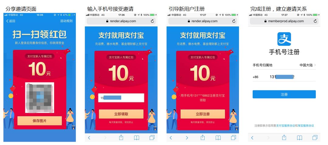 3.1.1 邀請(qǐng)好友注冊(cè)支付寶,雙方都可以領(lǐng)取10元紅包,只要新用戶在老用戶分享的H5頁面里,輸入手機(jī)號(hào),完成手機(jī)號(hào)注冊(cè)即可。10元現(xiàn)金紅包是赤裸裸的誘惑,這種現(xiàn)金補(bǔ)貼的邀請(qǐng)方式比較燒錢,適合經(jīng)濟(jì)實(shí)力雄厚的公司。采用現(xiàn)金補(bǔ)貼的方式,用戶能最大限度地感受到主辦方的真誠(chéng),提升用戶的信任度,尤其是像支付寶這樣的與金錢掛鉤的產(chǎn)品,用戶的信任與支持才是最重要的。