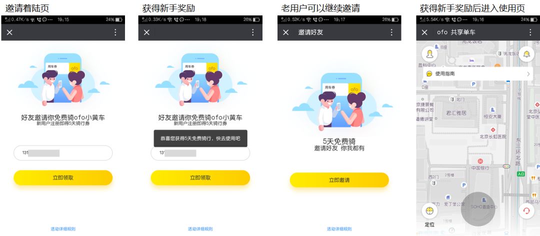 3.1.2 邀請(qǐng)好友注冊(cè)ofo,雙方都可以獲得5天免費(fèi)騎行券。正常情況下騎行1小時(shí)以內(nèi)是1元錢,對(duì)于經(jīng)常騎車的人來說,5天免費(fèi)騎行券>5元錢的價(jià)值,對(duì)于用戶來說,付費(fèi)產(chǎn)品免費(fèi)使用是最大的誘惑,本來聽說需要付費(fèi),就不太想用,但是既然有免費(fèi)的機(jī)會(huì)了,那就嘗試一下吧。這種把自身產(chǎn)品的功能和優(yōu)勢(shì)作為獎(jiǎng)勵(lì)的方式,是大部分互聯(lián)網(wǎng)公司常用的玩法。