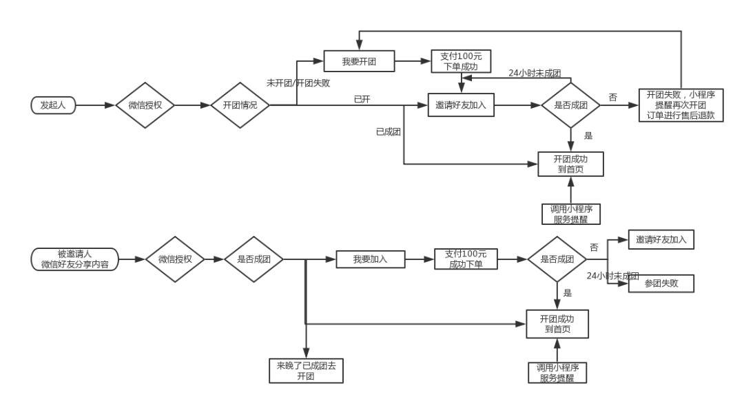 筆者這次負(fù)責(zé)的活動主要是在小程序中的拼團(tuán)活動,筆者將從發(fā)起人和被邀請人兩個維度來探討流程設(shè)計,具體詳情見下圖(流程存在一些不足,因為是用processon畫的流程,源文件沒有了,修改不了):