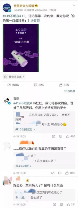 419不眠夜的時候,喜茶就被老司機杜蕾斯帶到了溝里。雙方發(fā)布了一張聯(lián)合海報,將芝士奶蓋和精液聯(lián)系到一起,大部分網(wǎng)友都表示“惡心到了”。