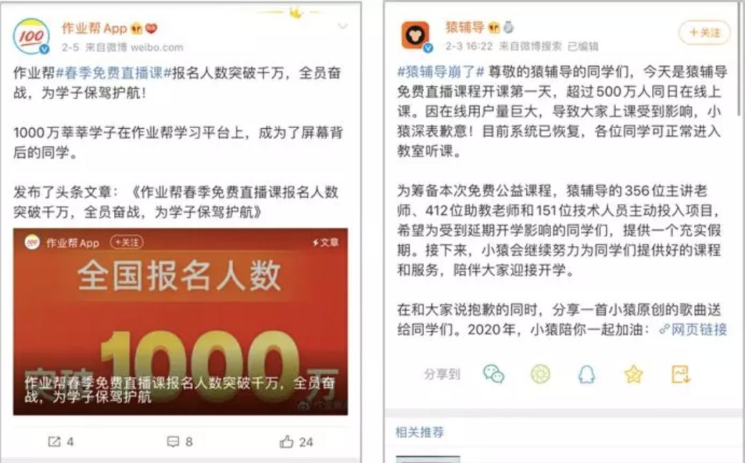 新冠病毒肆虐,全國人民開始了大門不出二門不邁的生活。起初大家是幸福的,現(xiàn)實(shí)卻是殘酷的,本以為在家遠(yuǎn)程辦公可以邊吃邊喝、躺著開會(huì),實(shí)際卻是會(huì)議不停消息不斷,甚至還要開視頻會(huì)議,逼著自己不得不上半身西裝下半身睡褲。 員工在家辦公雖然比在辦公室更累,效率更低,但和線下老板們相比要幸運(yùn)得多,因?yàn)榇蠖鄶?shù)基于線下流量的產(chǎn)業(yè)均受到此次疫情的巨大影響,比如線下餐飲企業(yè)西貝曾對外發(fā)聲僅能維持三個(gè)月,再比如很多中小線下教育機(jī)構(gòu)紛紛宣布破產(chǎn),解雇全部員工,整個(gè)線下可以用慘淡來形容。 野生運(yùn)營社區(qū)是聚焦在線教育領(lǐng)取的自媒體,自然要關(guān)注在線教育在此次新冠病毒肺炎疫情中的表現(xiàn),總體可以用兩個(gè)字來形容--幸運(yùn)。 之所以稱為幸運(yùn),首先是在線教育這樣基于互聯(lián)網(wǎng)的商業(yè)模式天然適合特殊時(shí)期幫助企業(yè)轉(zhuǎn)型和生存,現(xiàn)實(shí)也證實(shí)這一點(diǎn),幾乎全國線下教育機(jī)構(gòu)紛紛緊急轉(zhuǎn)到線上保證已有學(xué)員能繼續(xù)在機(jī)構(gòu)上課,來避免因?yàn)橐咔槎F(xiàn)金流斷裂。其次,教育部出于疫情防控的角度,延遲了全國學(xué)校開學(xué)時(shí)間,并且積極推動(dòng)在線學(xué)習(xí)方式,但限制了學(xué)習(xí)內(nèi)容,這讓在線教育企業(yè)紛紛推出符合政策的內(nèi)容來促進(jìn)最新一波增長。 實(shí)際上,此次疫情對所有行業(yè)都會(huì)帶來一些負(fù)面影響,在線教育也是如此,沒有一件事是百利而無一害,也沒有一件事是百害而無一利,重點(diǎn)是我們在面對危機(jī)到來時(shí),如何做到止損,甚至實(shí)現(xiàn)新的增長,這也是寫作本文的目的。 在疫情爆發(fā)初期,頭部在線教育機(jī)構(gòu)的反應(yīng)是非??斓?,紛紛捐贈(zèng)百萬千萬份免費(fèi)課程支援疫區(qū),后來因?yàn)橐咔榈臄U(kuò)大逐漸影響到學(xué)校,又陸續(xù)開啟完全免費(fèi)的公益課程服務(wù)。 圖片來自億歐 當(dāng)然,頭部在線教育機(jī)構(gòu)們不是簡單的推出公益課程,而是有相對系統(tǒng)的打法,目的顯然是為增長服務(wù)。 1、推出面向全年級(jí)的公益直播課 頭部在線教育公司面對此次疫情推出的核心打法是推出面向全年級(jí)的公益課,比如學(xué)而思網(wǎng)校、猿輔導(dǎo)、作業(yè)幫等。有目共睹的是,公益課效果非常好,猿輔導(dǎo)宣稱同時(shí)500萬人在線上直播課,作業(yè)幫宣布公益課報(bào)名突破1000萬人。 圖片來自運(yùn)營研究社 筆者看了幾個(gè)頭部的公益課內(nèi)容,大體分兩部分:一部分是基于校內(nèi)的同步課程,這是公益課的核心部分,尤其以寒假課程為主,而隨著疫情的持續(xù),這些在線教育公司不出意外會(huì)上線春季的同步課程,不符合教育部規(guī)定的則會(huì)嚴(yán)格限制,比如超前學(xué)習(xí);另一部分是素養(yǎng)課程、公益講座等,比如學(xué)而思網(wǎng)校的免費(fèi)素養(yǎng)課、猿輔導(dǎo)的大師講座、有道的“疫情防控第一課”等,目的是豐富學(xué)生的線上學(xué)習(xí)內(nèi)容,在疫情期間培養(yǎng)綜合能力。 正是因?yàn)橥瞥雒赓M(fèi)公益課策略,所有頭部在線教育機(jī)構(gòu)每天都有大量流量涌入,放在過去這是很難想象的,而在疫情期間面對成百上千萬的用戶,在線教育機(jī)構(gòu)務(wù)必保證公益課質(zhì)量,為后續(xù)的口碑轉(zhuǎn)化打下良好基礎(chǔ)。 2、在流量平臺(tái)同步內(nèi)容和推廣 除了推出公益課,如何讓公益課大規(guī)模曝光并吸引流量也是頭部在線教育公司們考慮的問題,巧合的是,主流互聯(lián)網(wǎng)平臺(tái)以及官媒因?yàn)橐咔榈男枰娂娡瞥隽斯鎸W(xué)習(xí)模塊,這為在線教育公司提供了品牌曝光的絕佳契機(jī)。 各大在線教育公司主要在這樣幾類平臺(tái)同步內(nèi)容和投放推廣。 一類是官媒平臺(tái),比如在央視頻和學(xué)習(xí)強(qiáng)國,猿輔導(dǎo)、作業(yè)幫、學(xué)而思網(wǎng)校等頭部在線教育公司就在這一類平臺(tái)同步直播公益課程,并且紛紛獲得人民日報(bào)、新華社、CCTV等官媒的報(bào)道,大大提升品牌曝光度。 另一類是在主流互聯(lián)網(wǎng)平臺(tái)比如今日頭條、抖音、快手、西瓜視頻、優(yōu)酷、愛奇藝、騰訊視頻等同步公益課程內(nèi)容,一般分為錄播和直播兩種形式,具體形式依據(jù)平臺(tái)而定,比如在抖音和快手就可以直播同步公益課內(nèi)容,可以借助平臺(tái)的流量扶持為賬號(hào)漲粉。 第三類是將自身的公益課程在外部進(jìn)行推廣,主要是自媒體投放和信息流投放,比如猿輔導(dǎo)和作業(yè)幫就在公眾號(hào)、今日頭條等進(jìn)行公益課程投放,通過引導(dǎo)報(bào)名免費(fèi)公益課程完成線索獲取。 對于中小機(jī)構(gòu),沒有錢和資源不建議與頭部玩家們競爭,但可以盡量嘗試參與流量平臺(tái)發(fā)起的公益課程活動(dòng),其實(shí)有很大機(jī)會(huì)獲取超過想象的流量效果。 3、推出免費(fèi)轉(zhuǎn)介紹策略,借著公益拉新 除了推出公益課并大規(guī)模投放,借助老帶新也是必用的手段,當(dāng)然,這種方式需要慎重,要注意發(fā)起的理由和節(jié)點(diǎn),比如在疫情爆發(fā)初期發(fā)起裂變,很
