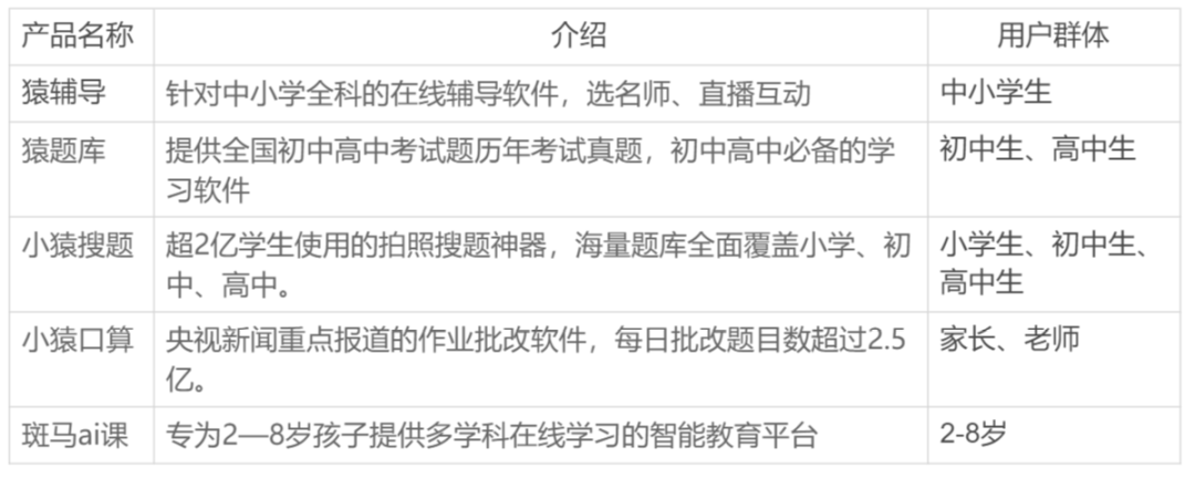 公司旗下?lián)碛性齿o導、小猿搜題、猿題庫、小猿口算、斑馬AI課等多款在線教育產(chǎn)品,為用戶提供網(wǎng)課、智能練習、難題解析等多元化的智能教育服務,幫助學生系統(tǒng)性、高效率的完成學習閉環(huán)。