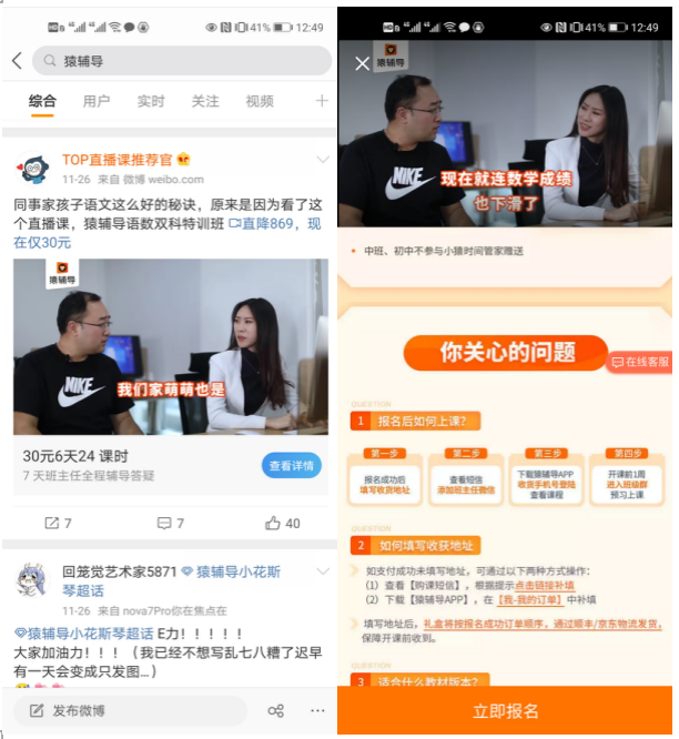 總結:快速發(fā)展階段,猿輔導在各大熱門平臺都進行了廣告投放,快速曝光,進行搶占流量。