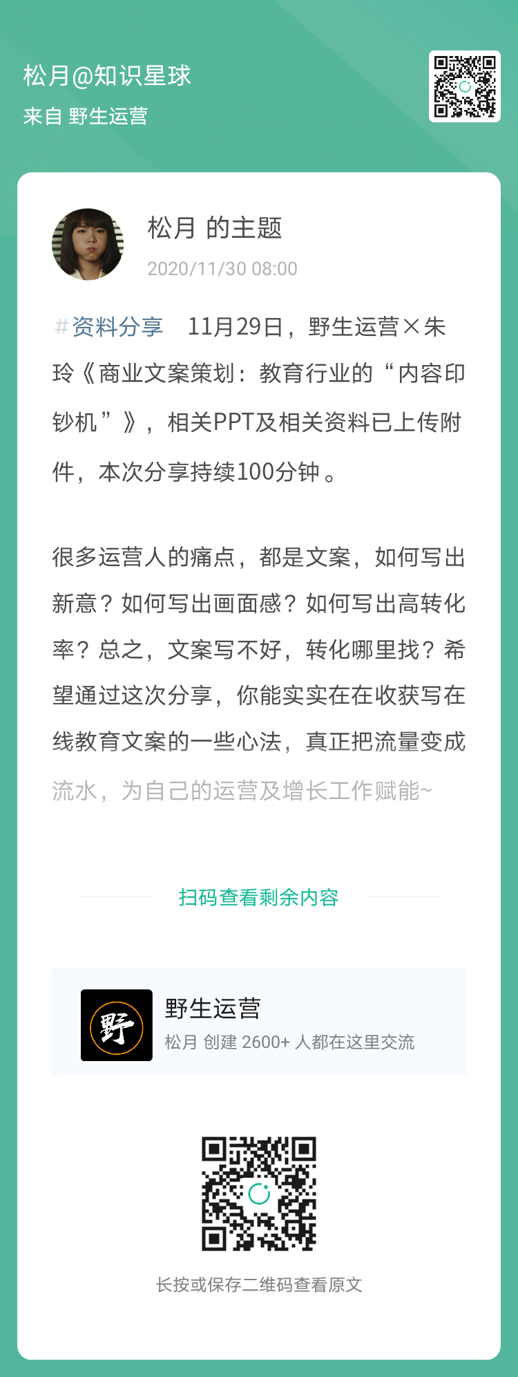 1、野生運(yùn)營(yíng)×朱玲《商業(yè)文案策劃:教育行業(yè)的“內(nèi)容印鈔機(jī)”》(掃碼看全文)