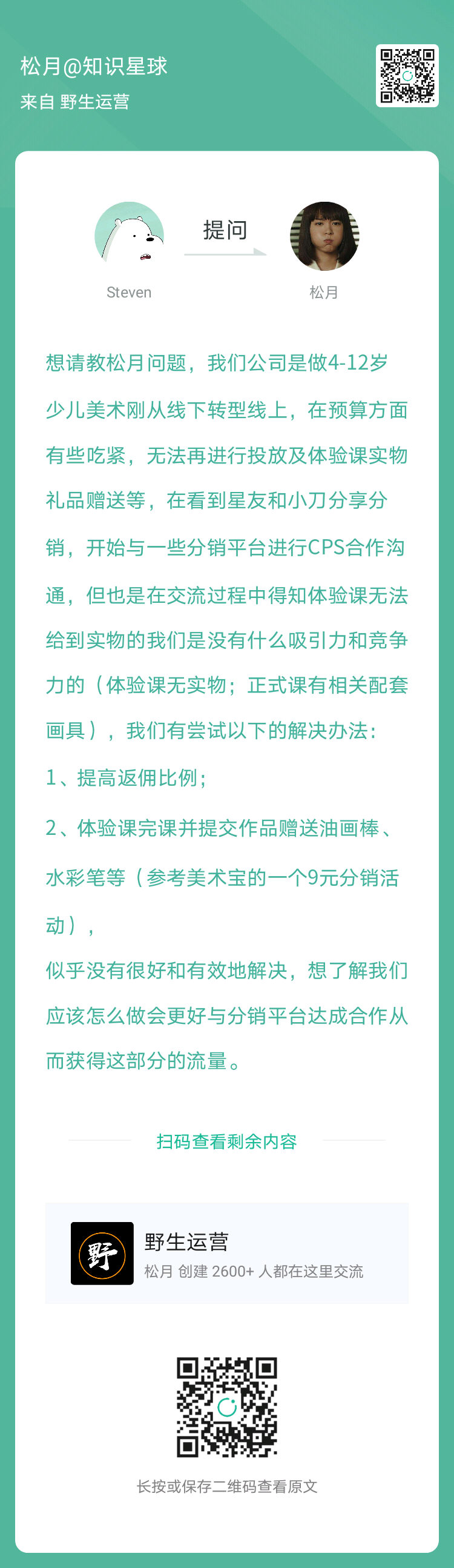 3、提問:少兒美術(shù)沒有預(yù)算再投分銷平臺(tái),還有什么辦法可以和分銷平臺(tái)繼續(xù)合作?(掃碼看全文)