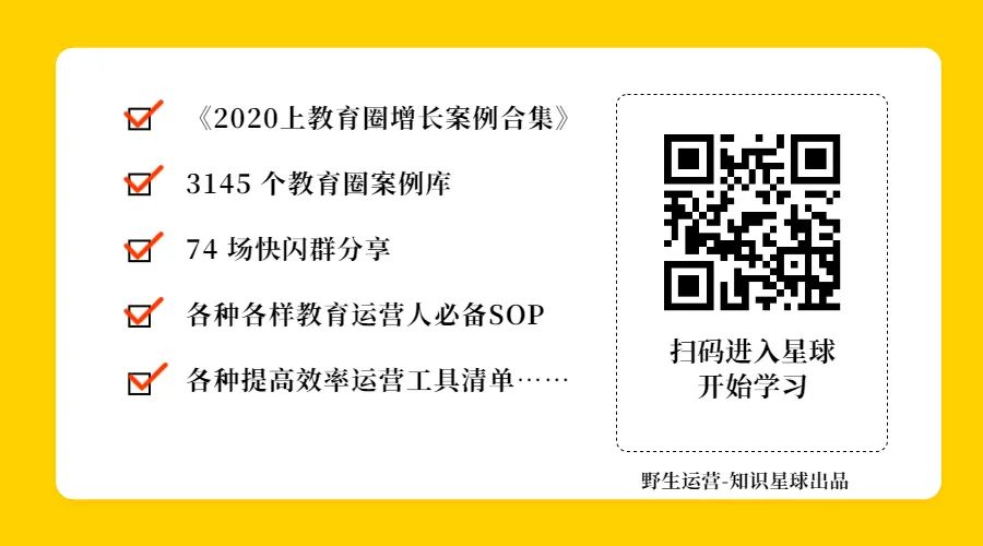 歡迎加入野生運(yùn)營(yíng)星球,有不定期快閃分享、教育圈一手資料、1V1答疑……等硬核干貨,而且還能一次入手共計(jì) 3145 個(gè)增長(zhǎng)案例拆解,就問你句,值不值?加入星球請(qǐng)先看置頂文件,其中在線教育圈最全運(yùn)營(yíng)資料合集包括 《2020上半年教育圈增長(zhǎng)案例合集》、3145 個(gè)在線教育圈案例合集全庫(kù)、70 頁(yè)下沉市場(chǎng)觀察合集、74 場(chǎng)群分享的音頻+逐字稿、N多運(yùn)營(yíng)工具包和資料~