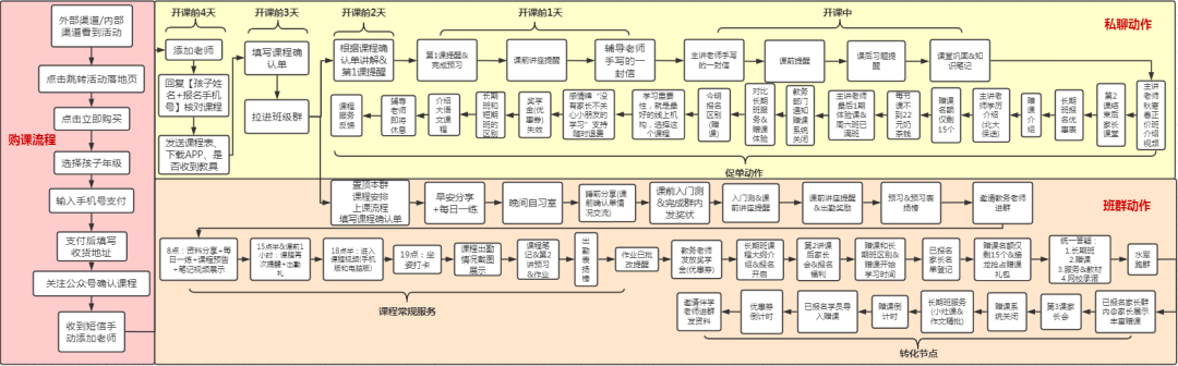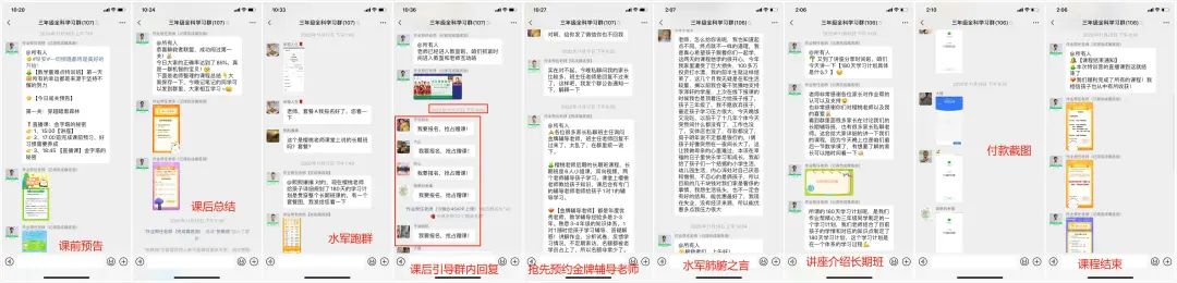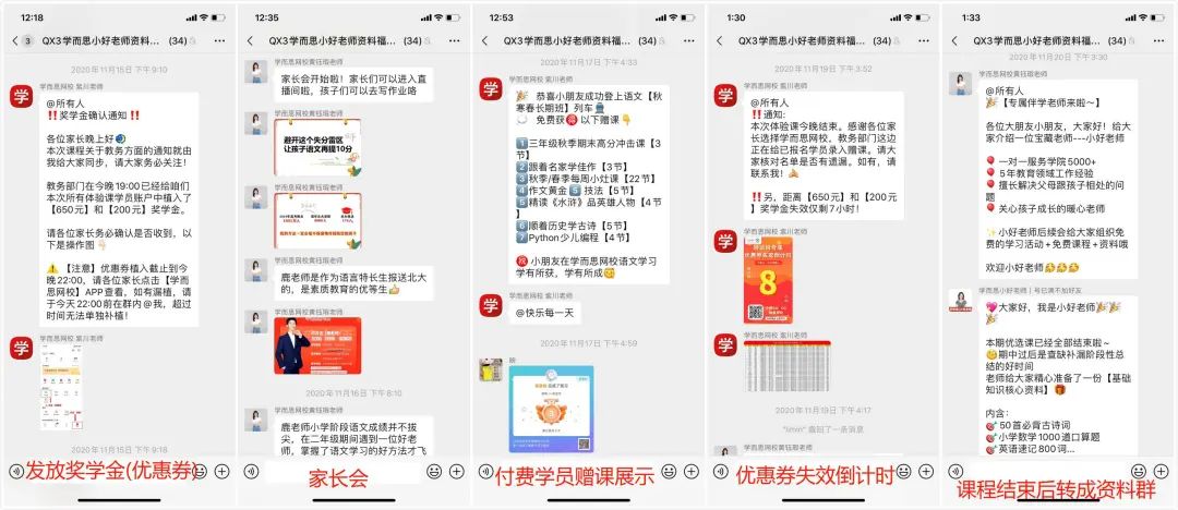 多人配合:邀請(qǐng)教務(wù)老師進(jìn)群,兩人打配合,班主任老師負(fù)責(zé)課程提醒,教務(wù)老師負(fù)責(zé)優(yōu)惠券、贈(zèng)課事宜,主講老師做宣傳,水軍跑群