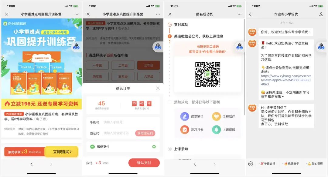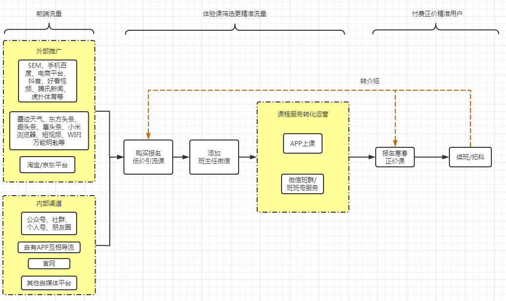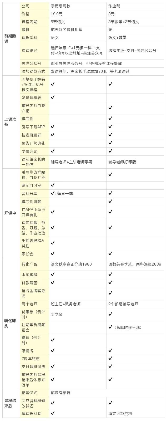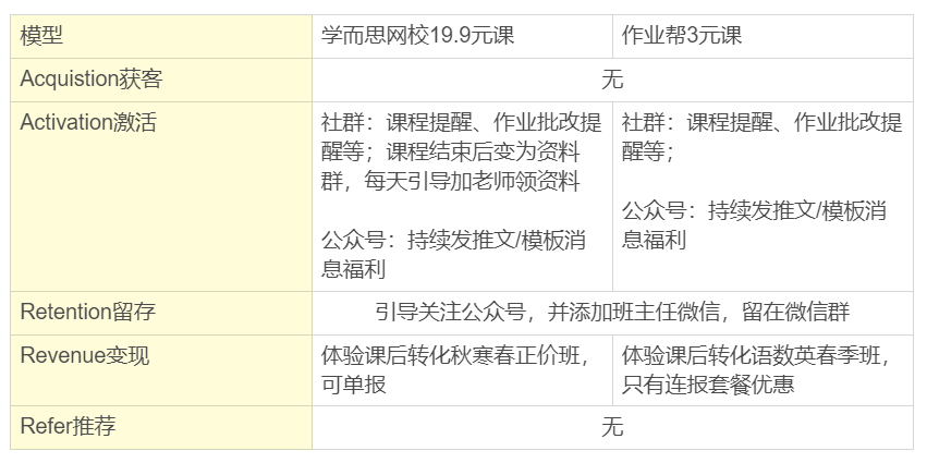 學(xué)而思和作業(yè)幫都是以低價(jià)雙師直播引流體驗(yàn)課,通過(guò)5天課程體驗(yàn)+社群運(yùn)營(yíng),最終來(lái)轉(zhuǎn)化正價(jià)班。