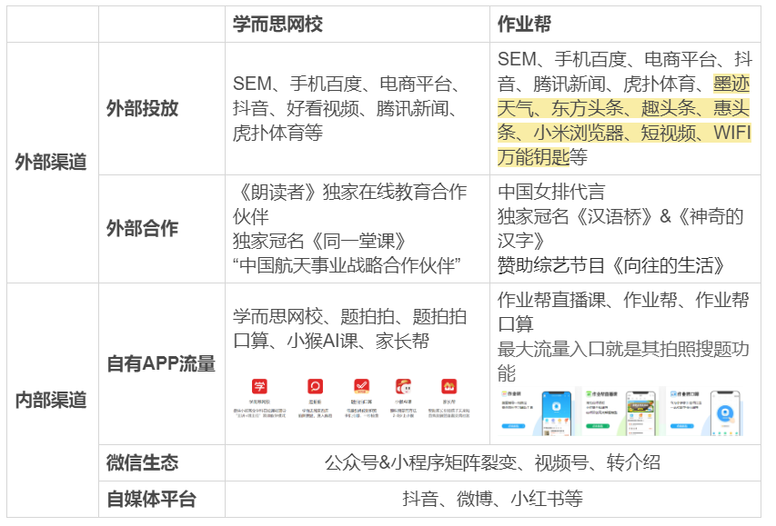 猿輔導(dǎo)和作業(yè)幫的大部分流量來(lái)自于自己的工具產(chǎn)品、投放、廣告和微信生態(tài),其中微信生態(tài)做的不算很好,微信生態(tài)做的最好的是跟誰(shuí)學(xué)。