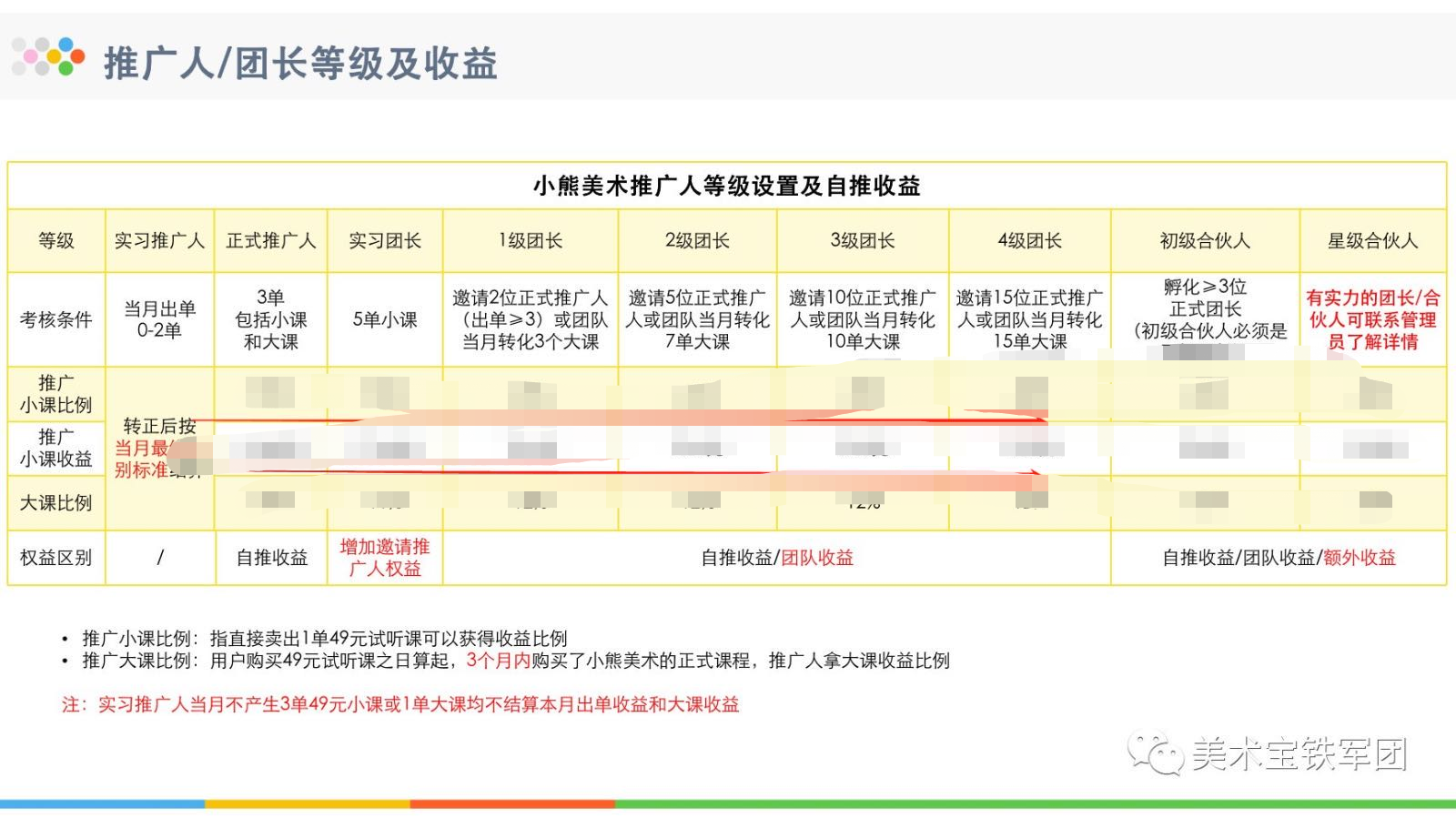 小熊美術(shù)傭金采用CPA+CPS的制度,體驗課30%-40%的一級傭金比例和10%-15%,大課10%-12%的一級傭金比例和2.5%-5%的二級收益,并且星級合伙人享有10%的團隊收益