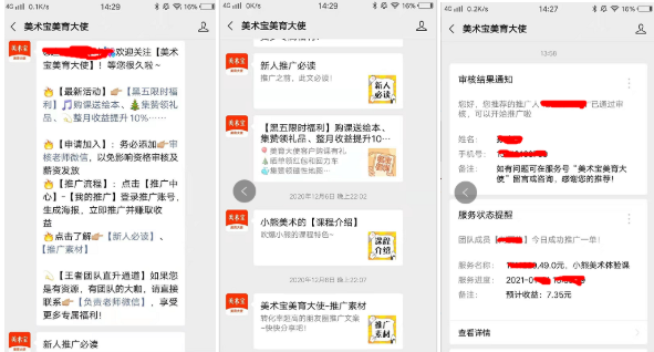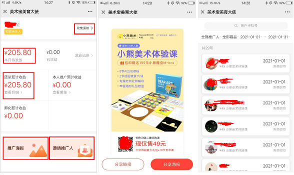 工欲善其事必先利其器,那就先拿分銷系統(tǒng)來說,小熊美術(shù)自建分銷系統(tǒng),畢竟有美術(shù)寶強大的技術(shù)團隊做支撐。小熊美術(shù)的分銷系統(tǒng)是搭配專屬公眾號做的,可以實現(xiàn)成單的信息提醒和邀請信息的提醒。
