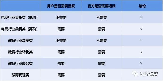 通過這張表我們可以看到,不是所有的社群都必須要以活躍為標(biāo)準(zhǔn)的,比如像電商類的賣貨群,這些群最大的作用是當(dāng)做流量渠道,有新品或促銷品時(shí)可以在群里發(fā)鏈接,起到廣告的效果。再比如一些教育類的裂變?nèi)?,關(guān)鍵作用就是通過社群,以試聽課為誘因,快速找到潛在用戶,又或者以社群為基點(diǎn),通過分銷的模式來實(shí)現(xiàn)課程銷售的裂變等等。