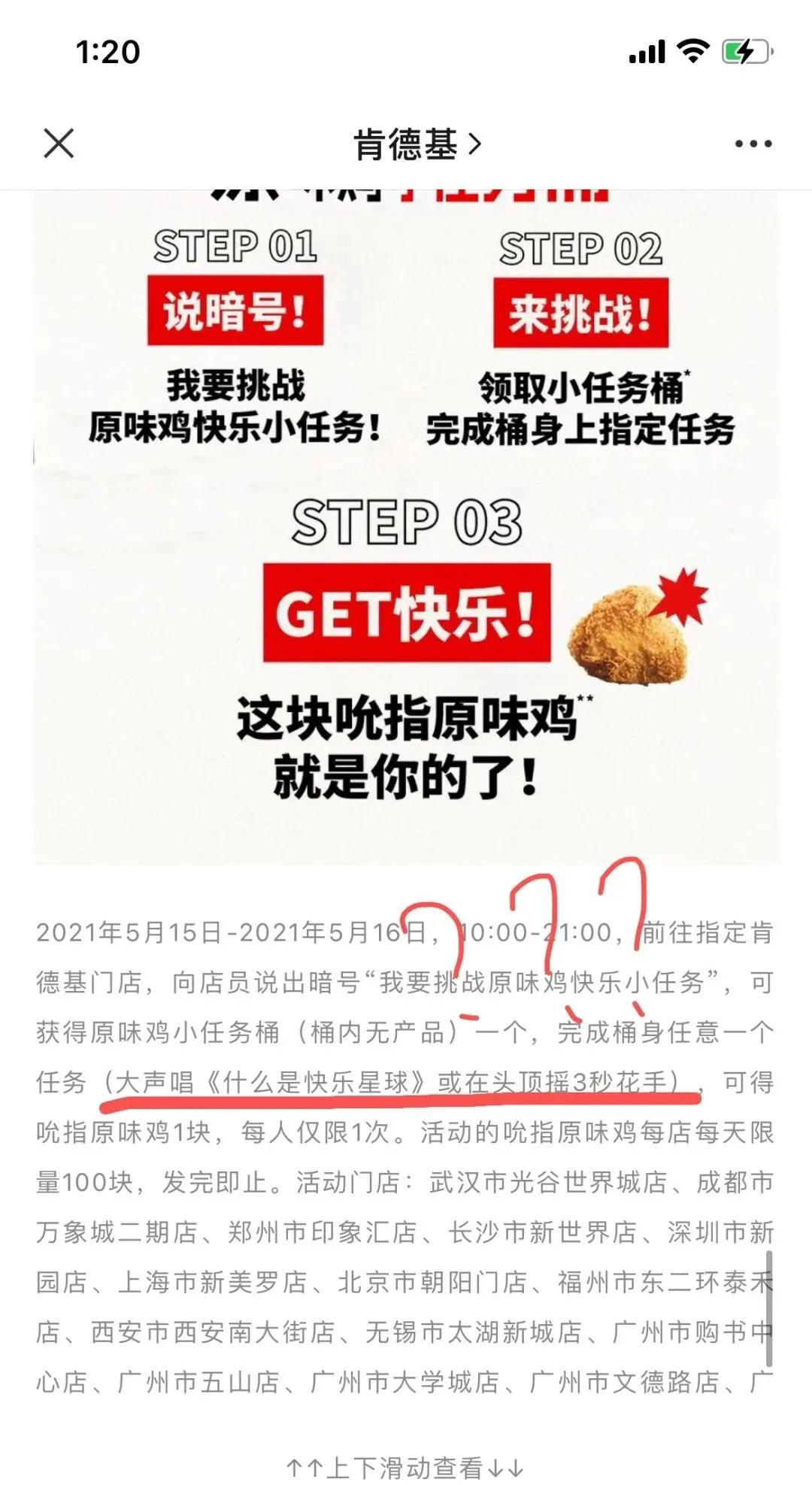 只要你在店內(nèi)大聲唱《什么是快樂(lè)星球》或在頭頂搖3秒花手,就可以獲得吮指原味雞一塊!