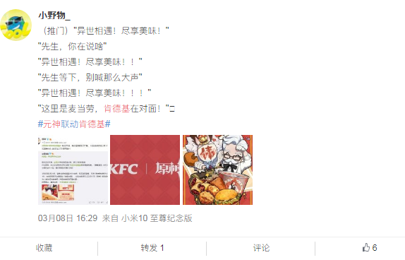 在線下肯德基主題店的活動(dòng)中,雙方表示還將免費(fèi)將送出聯(lián)動(dòng)的徽章。隨即,福利活動(dòng)引發(fā)眾多玩家的圍觀,萬(wàn)萬(wàn)沒(méi)想到讓眾多玩家社死的是,想要獲得限量徽章,需到店購(gòu)買(mǎi)原神聯(lián)動(dòng)套餐,還要對(duì)店員說(shuō)出“異世相遇,盡享美味”的口令。