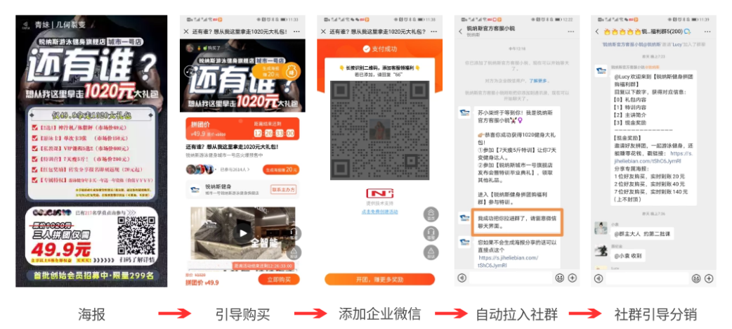 用戶購買后引導(dǎo)添加企業(yè)微信領(lǐng)取福利,企業(yè)微信通過幾何裂變的【SOP拉群】自動邀請用戶進群,群歡迎語+企業(yè)微信【SOP計劃】消息自動提示用戶生成專屬海報分享給好友,好友購買后20元現(xiàn)金實時到賬微信零錢,邀請3位好友購買還可再解鎖健身包/會籍月卡(2選1)。階梯權(quán)益+20元現(xiàn)金實時到賬雙重刺激用戶分享裂變。