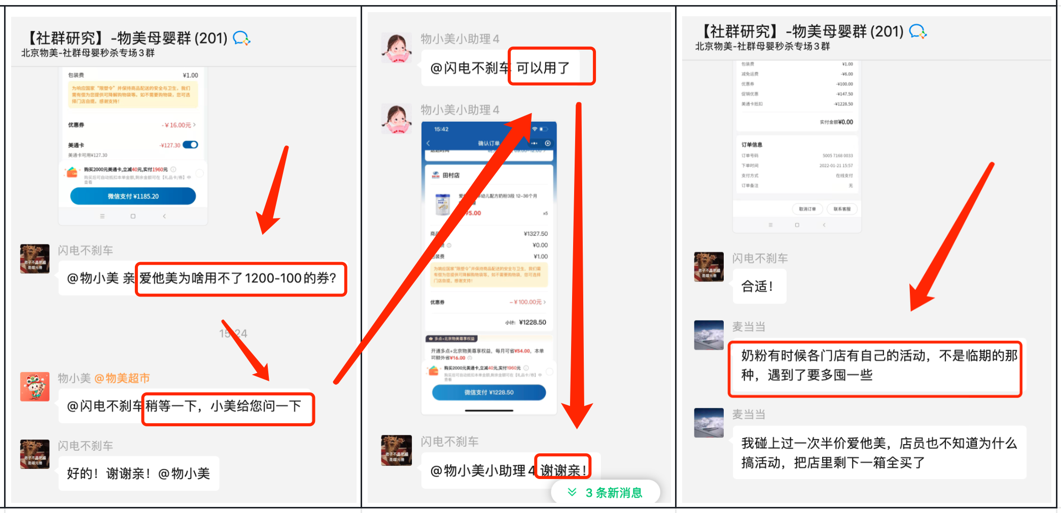 因為母嬰群已經(jīng)對社群活動有了認知與信任,所以新的流量主要來自物美總?cè)海锩拦芾韱T會在總?cè)和ㄟ^活動預(yù)告,吸引群內(nèi)的母嬰人群添加@物小美,由物小美拉入母嬰群。