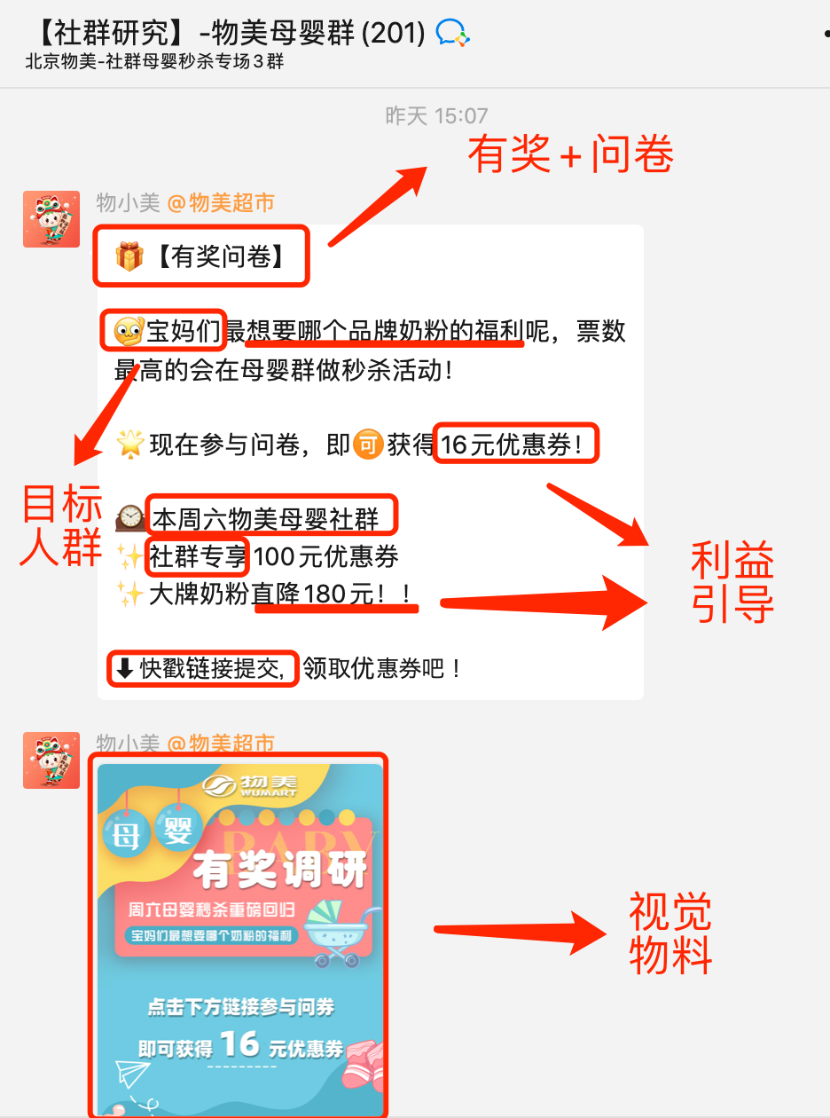 此外,為了刺激群內(nèi)消費者積極填寫,物美的運營人員,以「16元優(yōu)惠券」作為利益鉤子,吸引消費者填寫。