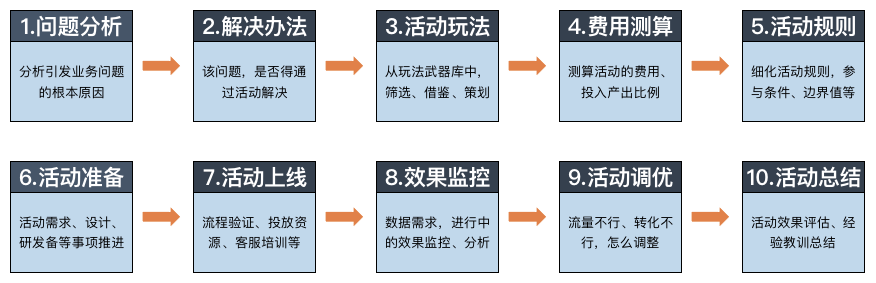 9、活動(dòng)調(diào)優(yōu):流量不行,是否是投放資源問(wèn)題;轉(zhuǎn)化不行,是否是活動(dòng)頁(yè)面問(wèn)題或者出了系統(tǒng)bug,還是本身玩法就不行。針對(duì)性調(diào)整,提升效果。